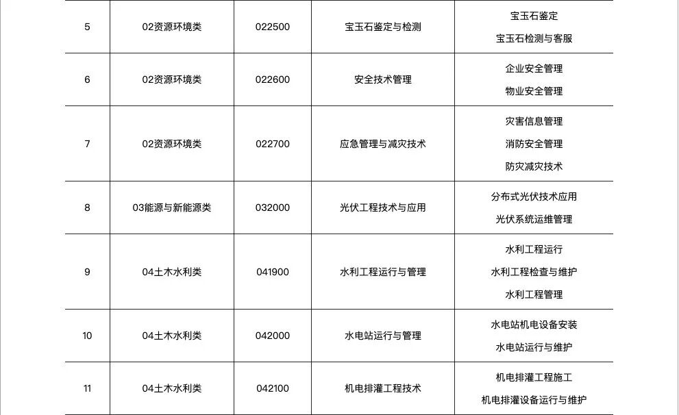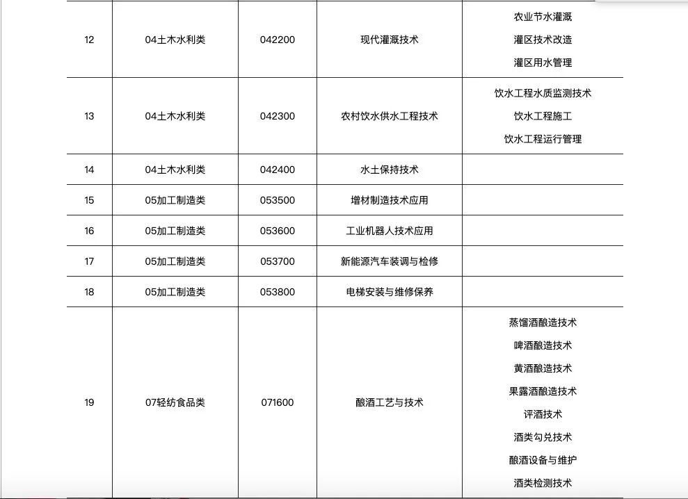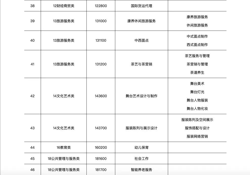 新增补的46个专业,主要涉及14个专业类,其中财政商贸类7个,土木水利类6个,交通运输类5个,资源环境类、加工制造类、信息技术类各4个,农林牧渔类、旅游服务类各3个,轻纺食品类、医药卫生类、文化艺术类、公共管理与服务类各2个,能源与新能源类、教育类各1个。