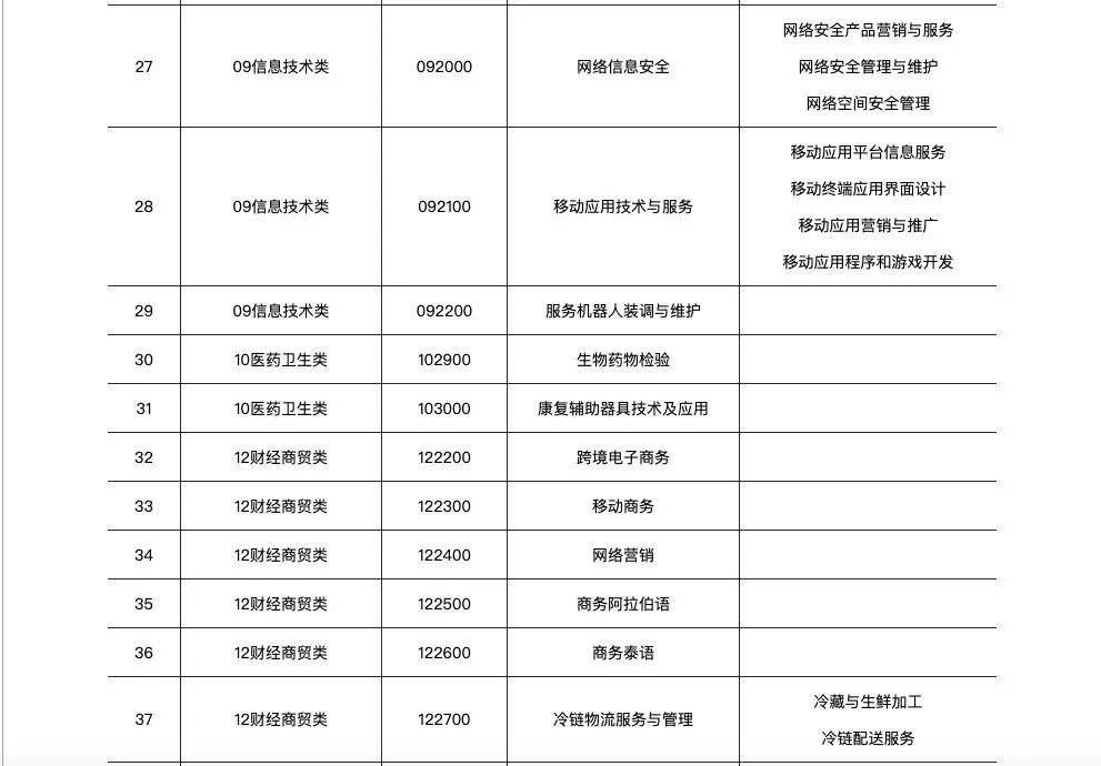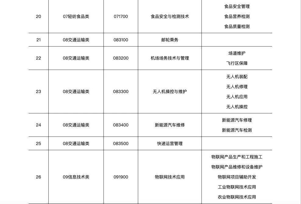 此次为服务物联网、智能机器人、移动应用、信息安全等新产业,增补了物联网技术应用、服务机器人装调与维护、移动应用技术与服务、网络信息安全等专业;为服务无人机及通用航空器产业发展,增补了无人机操控与维护、机场场务技术与管理等专业。