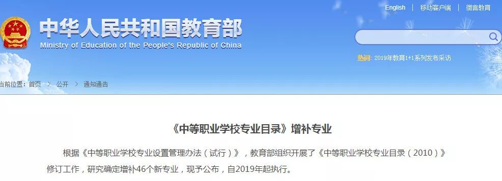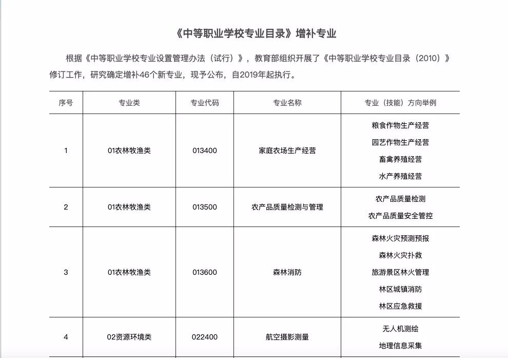 6月26日,根据《中等职业学校专业设置管理办法(试行)》,教育部组织开展了《中等职业学校专业目录(2010)》修订工作,研究确定增补46个新专业,现予公布,自2019年起执行。 教育部介绍: