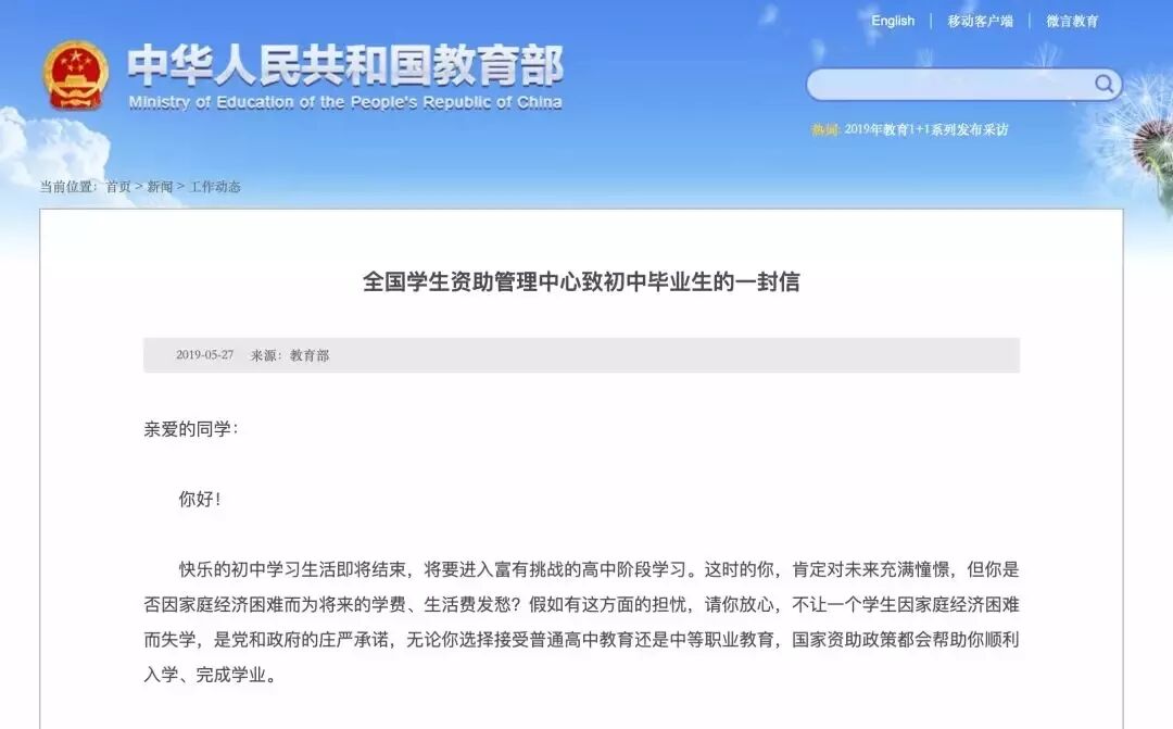 此前,教育部官网公布的“全国学生资助管理中心致初中毕业生的一封信”中表示,“不让一个学生因家庭经济困难而失学,是党和政府的庄严承诺,无论你选择接受普通高中教育还是中等职业教育,国家资助政策都会帮助你顺利入学、完成学业。”